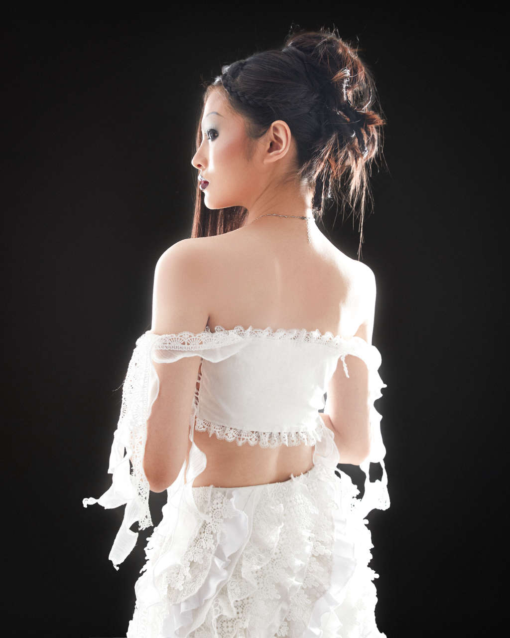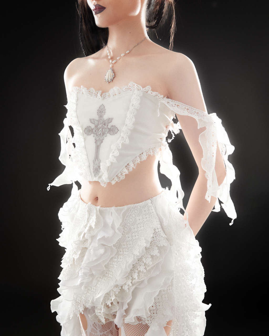 Corset with cross print, lace and chiffon border, self-adjusting tie sleeves, self-adjusting straps on both sidesFabric: khaki, lace, chiffonCare :Dry clean or handwash with water
