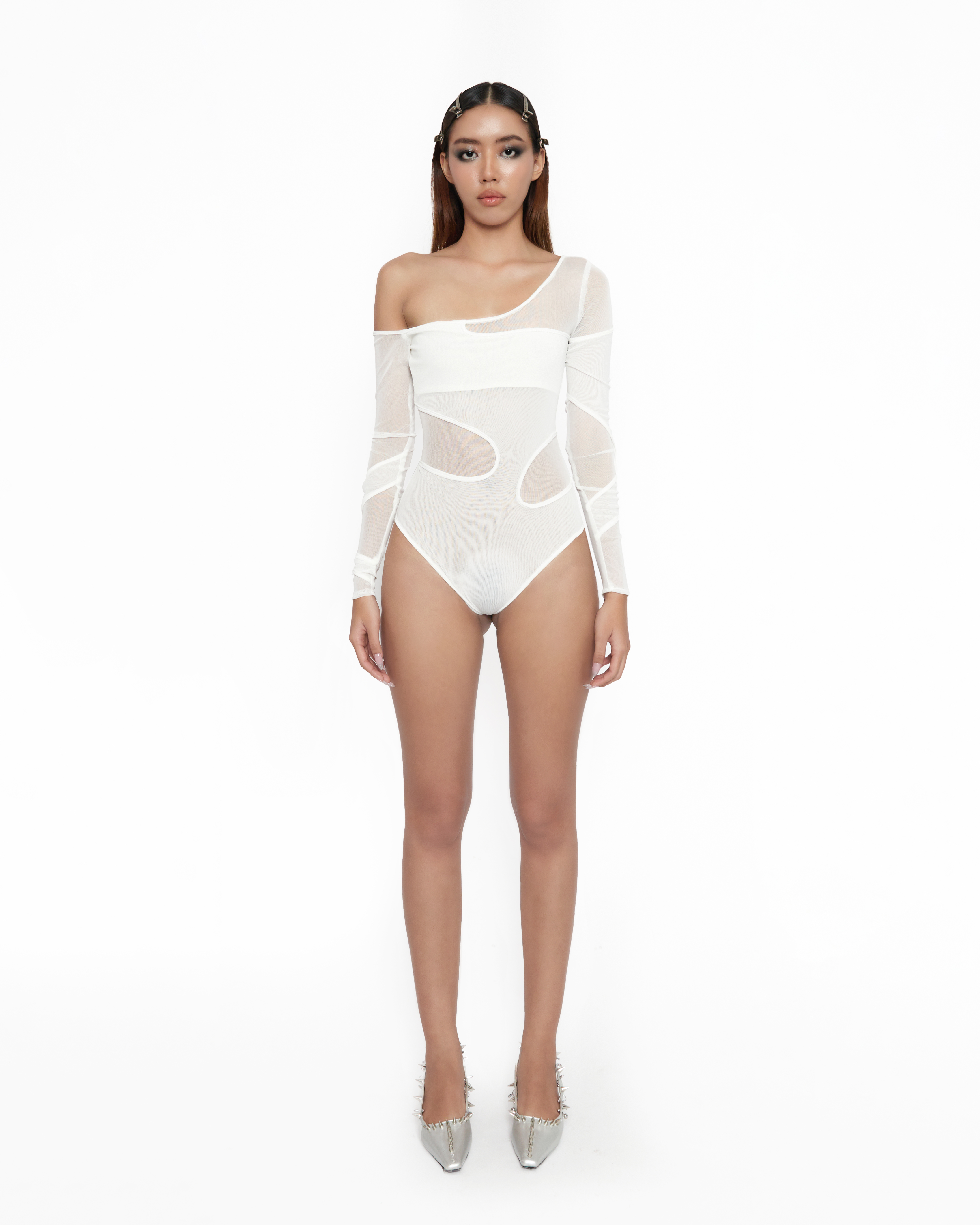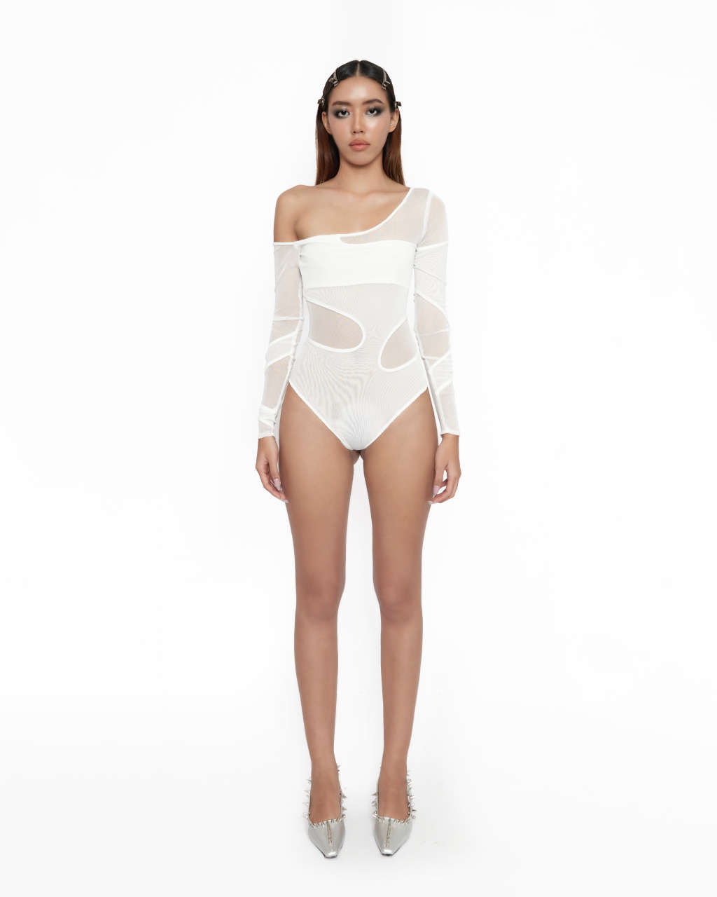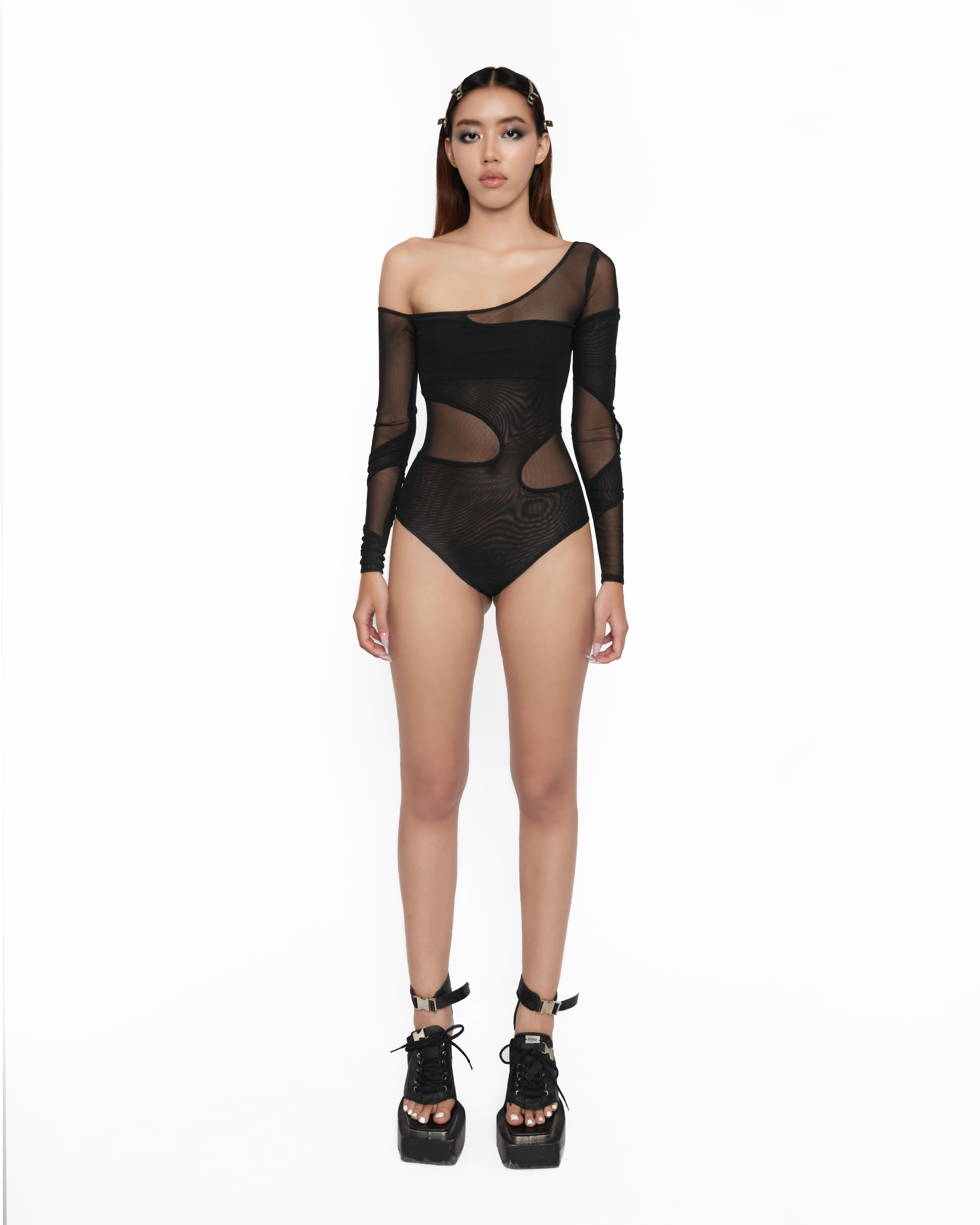 Half shoulder cut bodysuit, with three layers, two see-through cutout layers, one chest liningโจStretchy material โจCare : โจDry clean or handwash with water