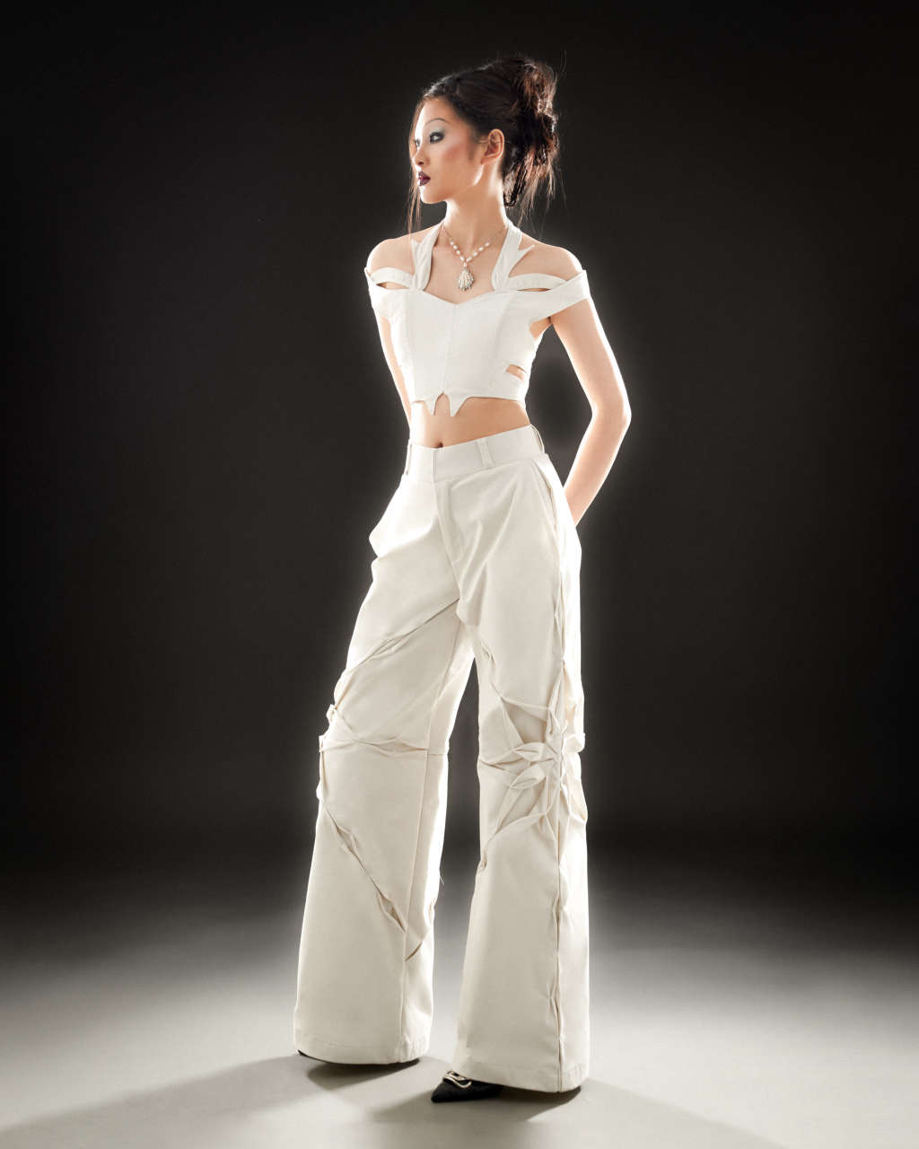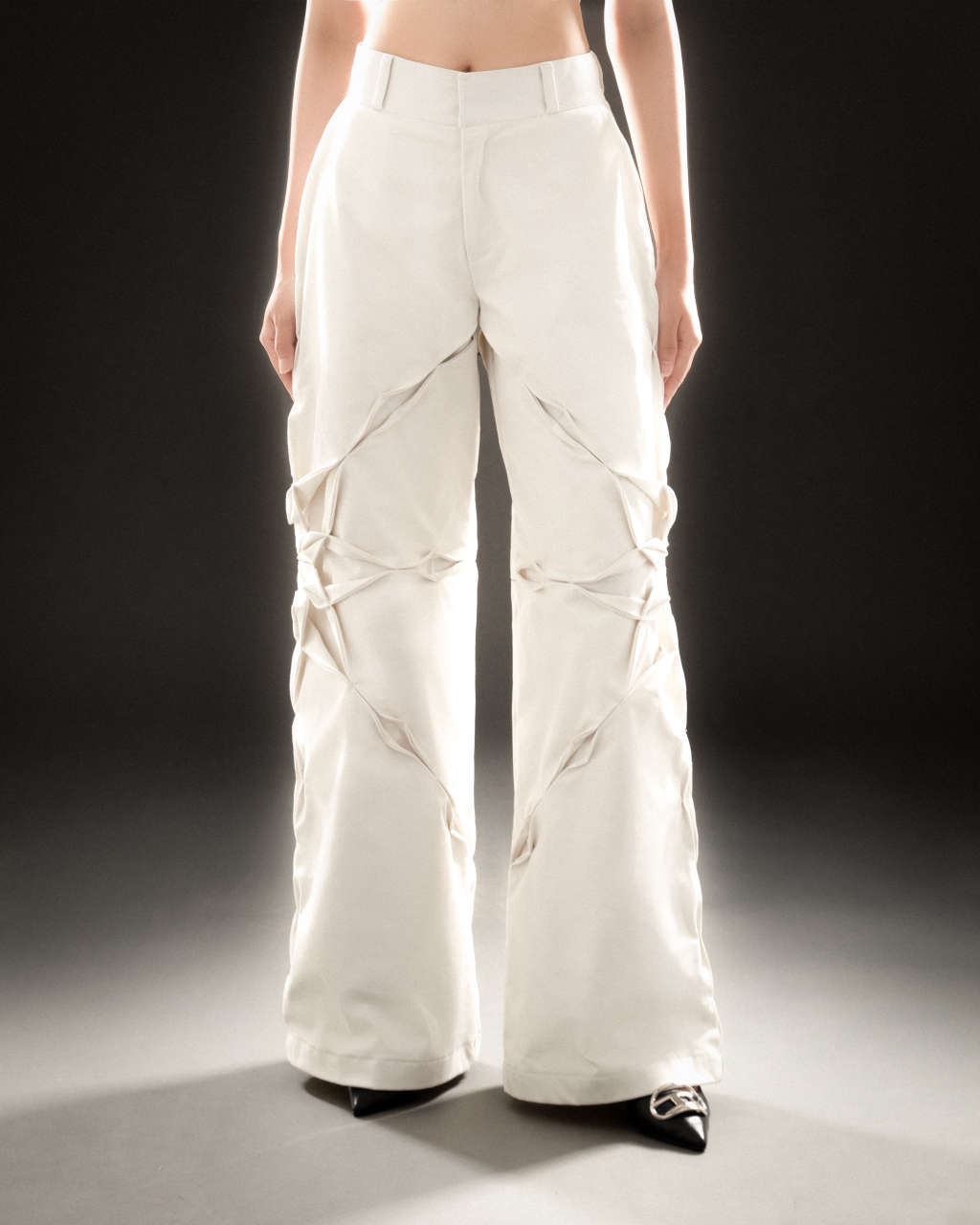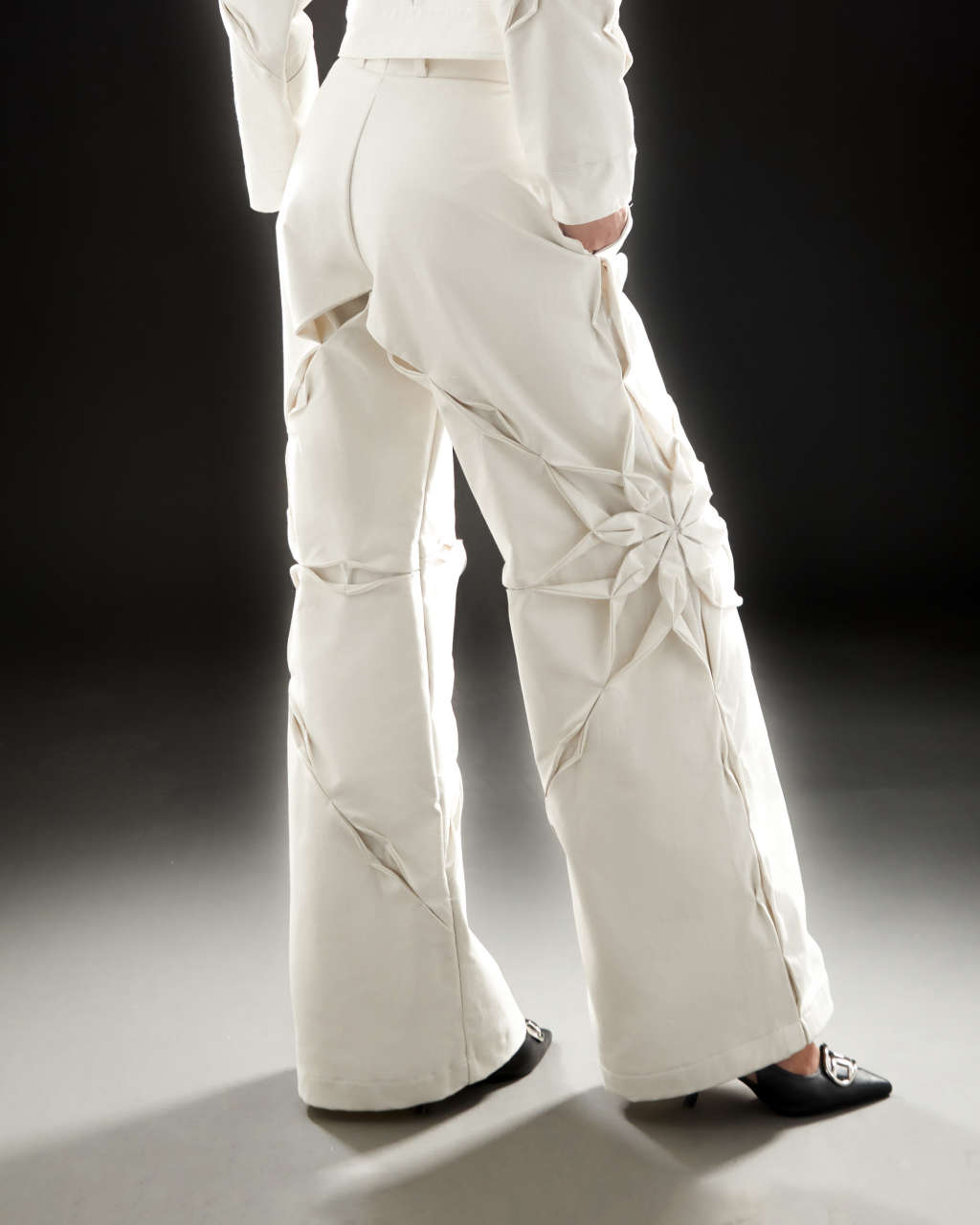 two layers, arranged in a flower pattern on both sides of the pants, two pocketsKhaki fabric, synthetic cotton materialCare :Machine wash ,dry clean or handwash with water