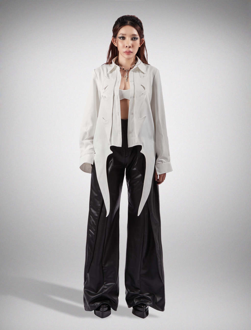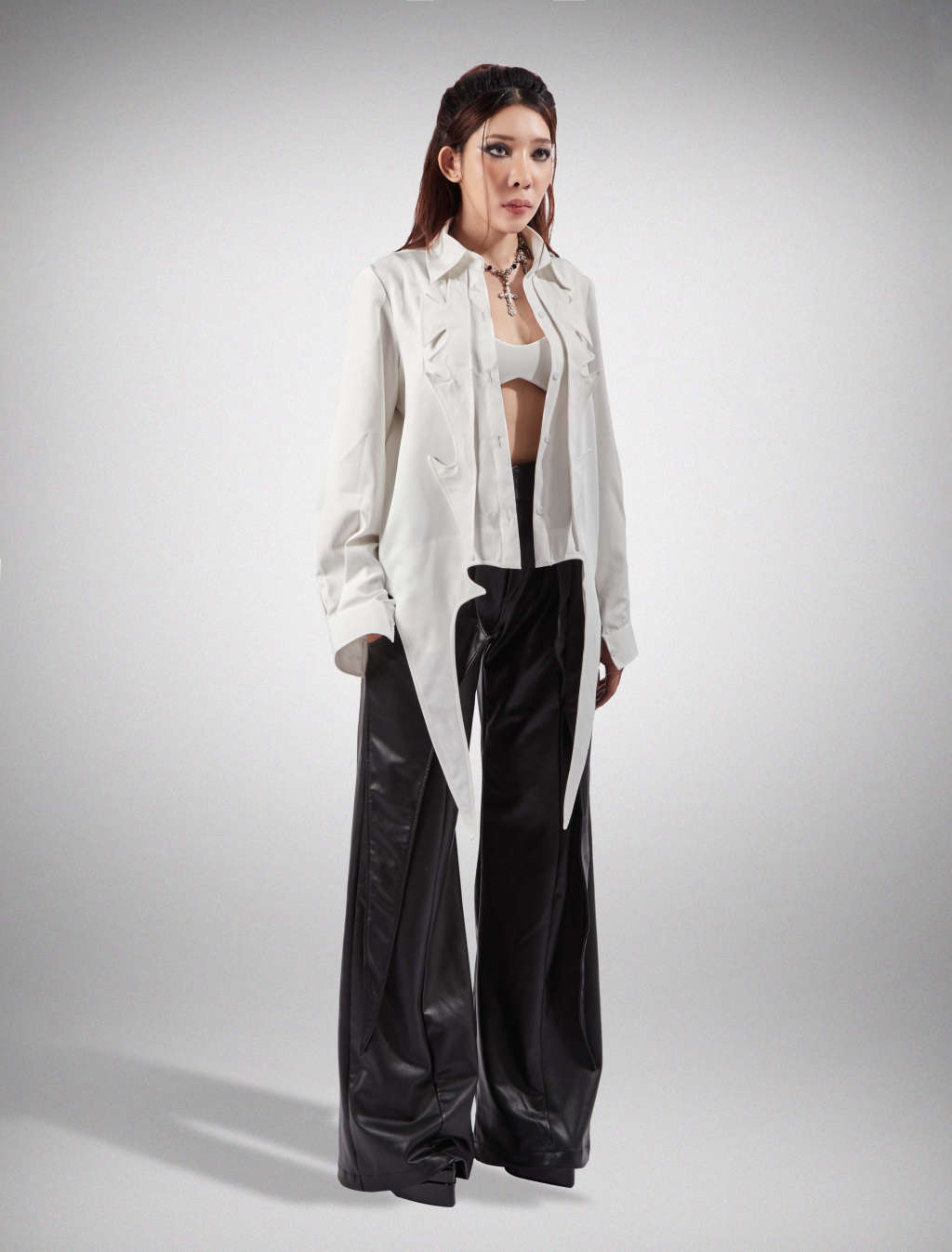 The shirt has 4 long flaps, 2 long strap details sewn upside down, placed under the neckcotton and polyester material, kate fabric Care :Machine wash, dry clean or hand wash with water