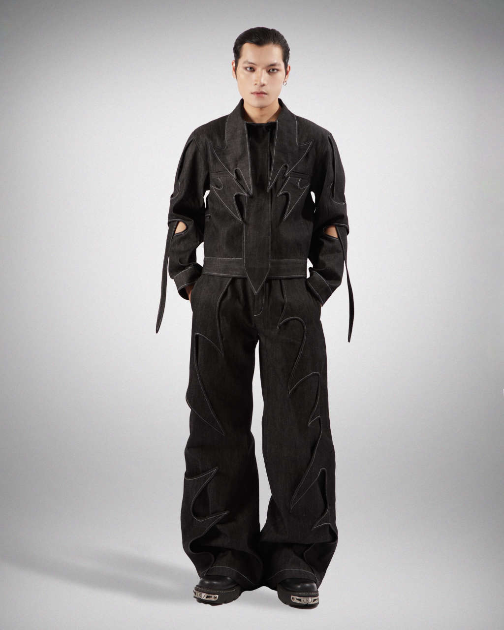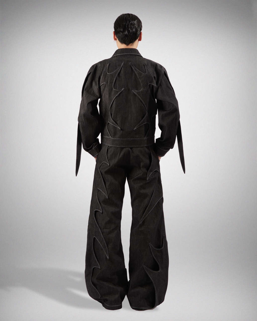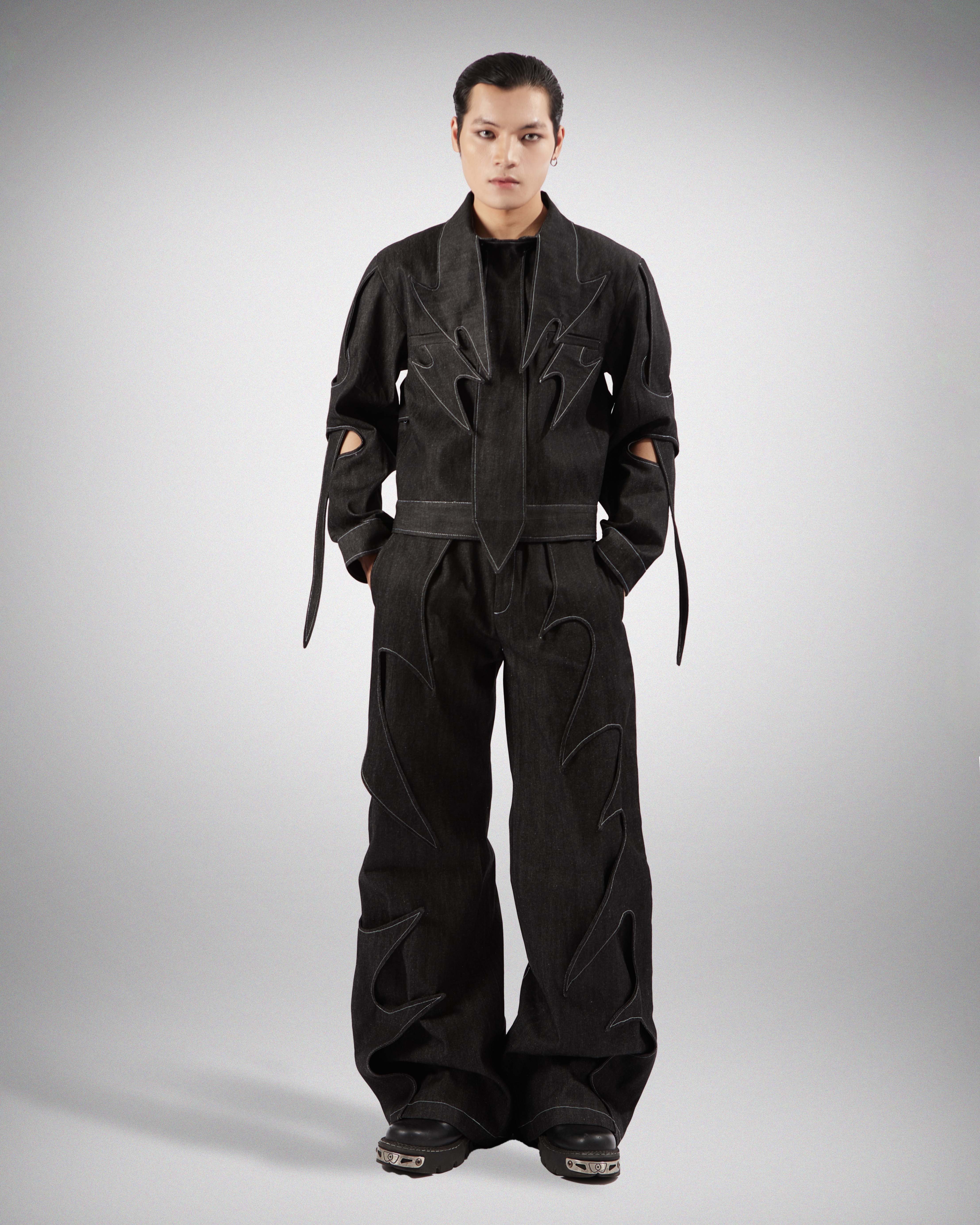 Long neck, two pockets, holes for long straps on both arms, and an included tieRaw denim (unwashed)Care :Machine wash, dry clean or hand wash with water