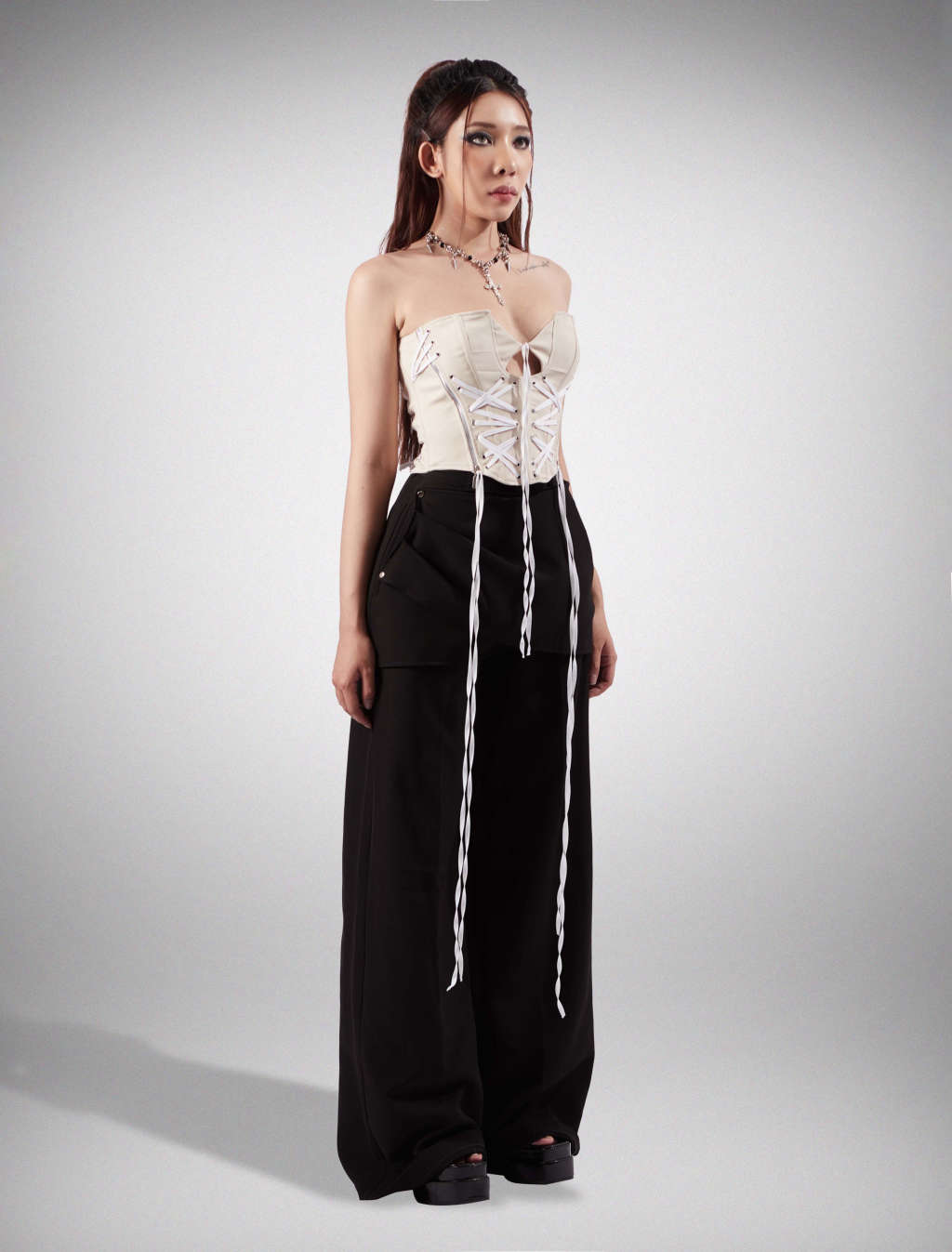 two layers, cut out in the middle of the chest and tied with a string, with underwire inside, zip on both sides of the front body, cut out hole in the middle of the body and woven straps, self-adjusting straps at the back