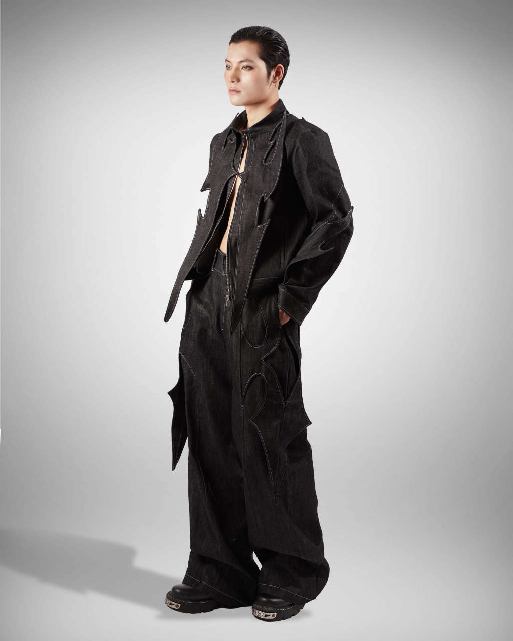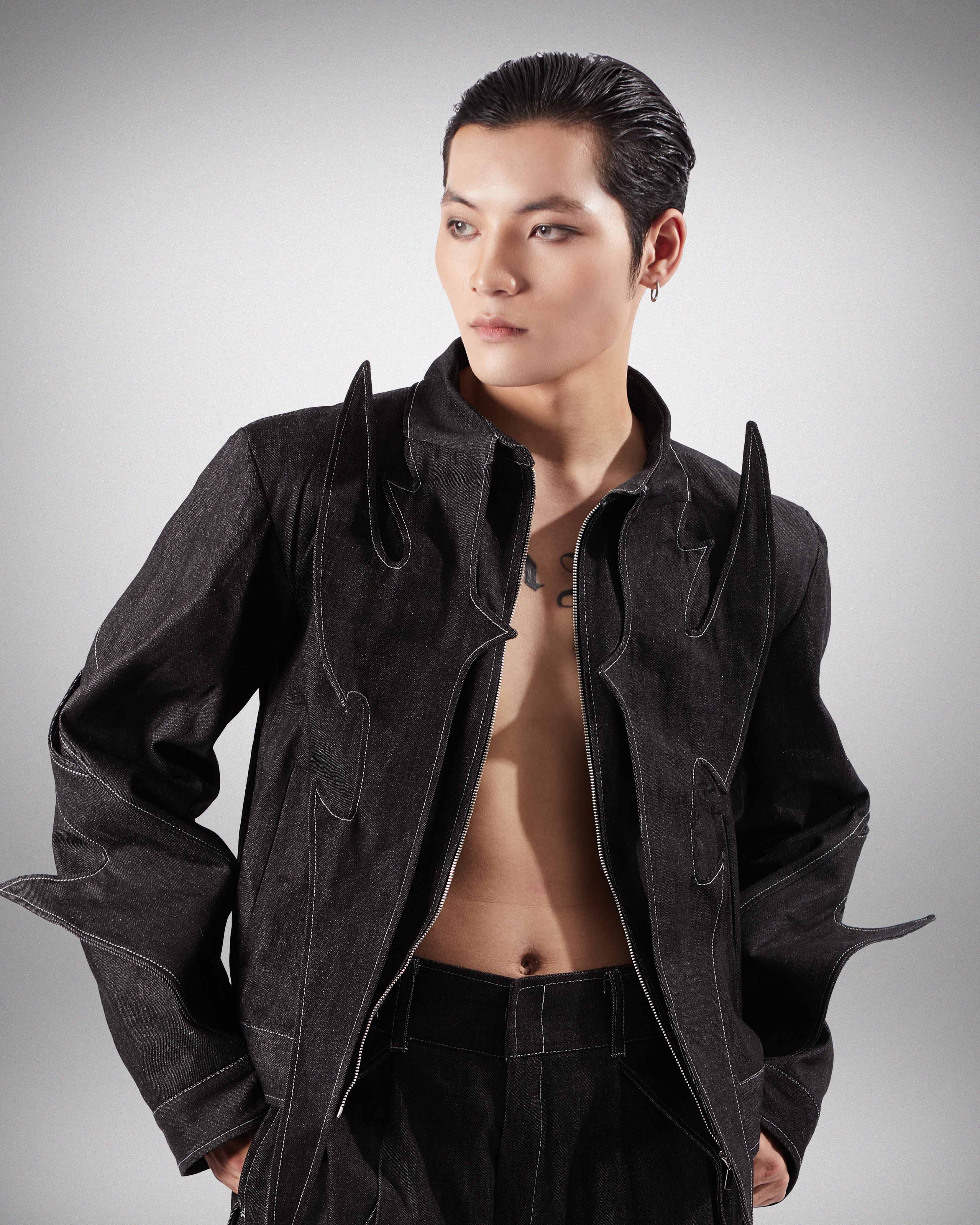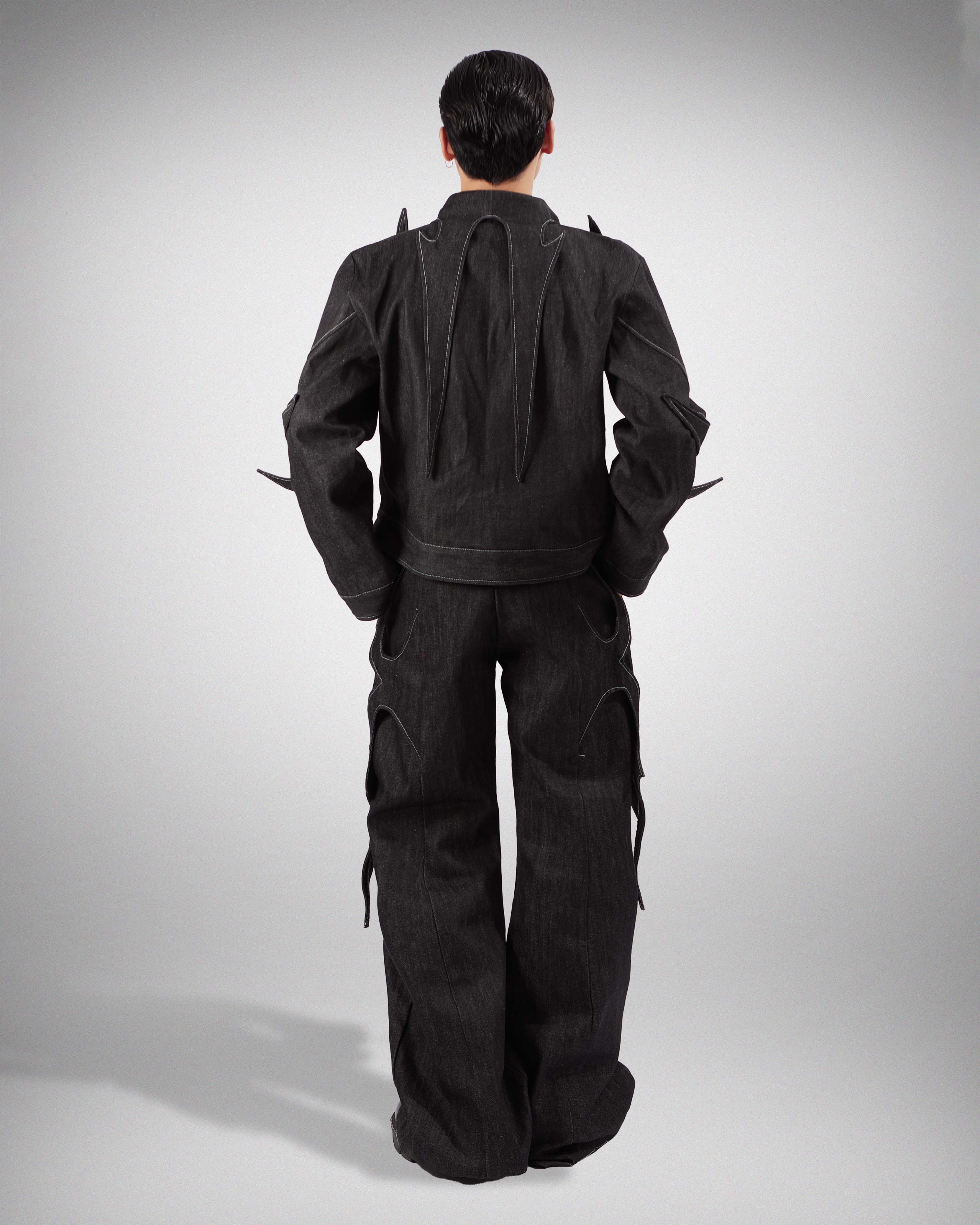 Long double-layered collar, white trim, two pocketsRaw denim (unwashed)Care :Machine wash, dry clean or hand wash with water