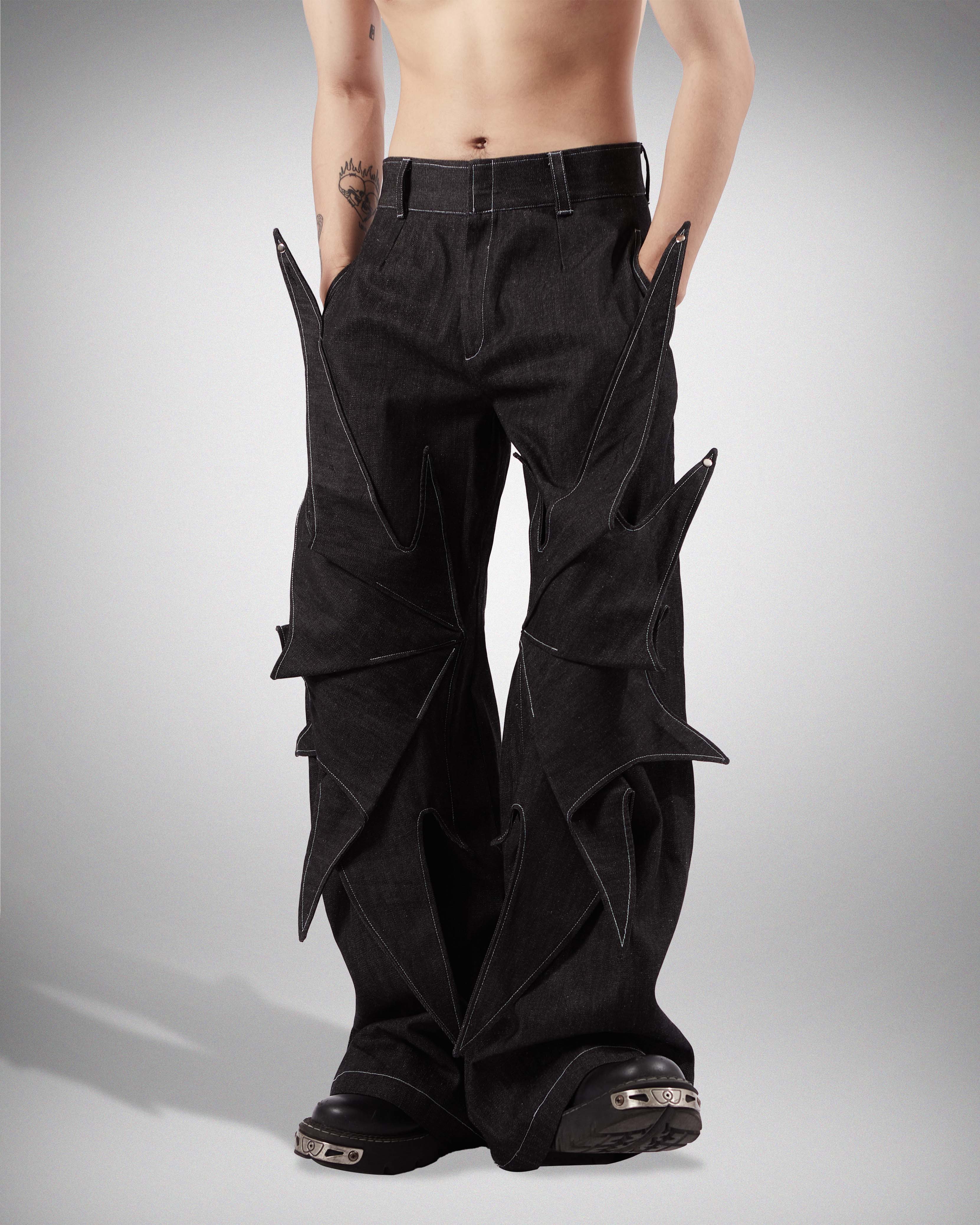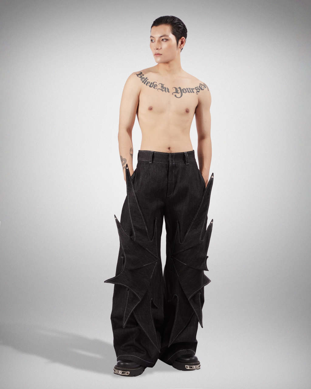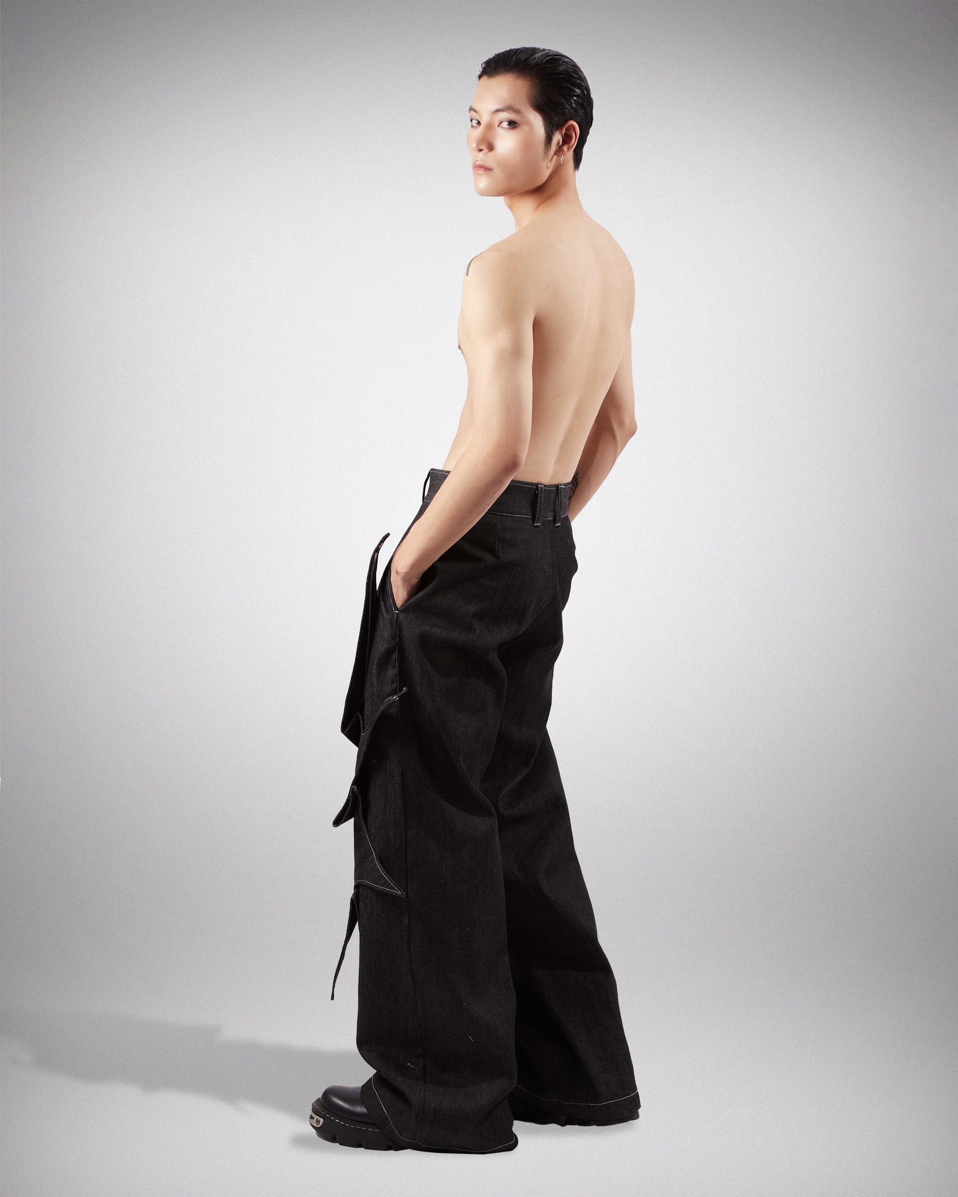 two pockets, double-layer details, overlapping stitching, white trim. The pointed ends have button closures for fixationRaw denim (unwashed)Care :Machine wash, dry clean or hand wash with water